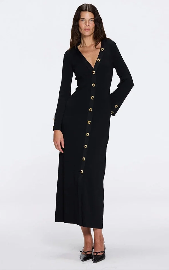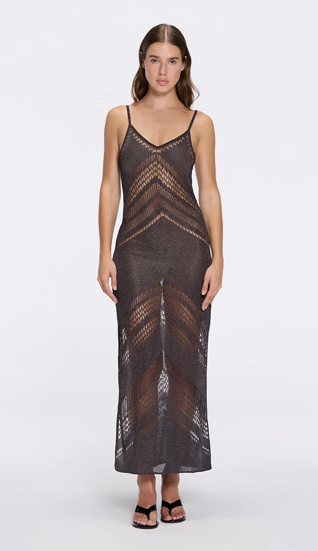 Another notable piece within MOEVA’s universe is the Beaulieu Black Metallic Knit Maxi Dress, distinguished by its V-neckline and subtle side slit. This design has remained part of the brand’s vocabulary for years, regularly appearing on public figures and becoming a recognisable signature within MOEVA’s collections. Reinterpreted from season to season in new colour variations, it reflects a continuity in design rather than a passing moment — a reminder that certain silhouettes earn their place through longevity. Watching how this piece evolves across collections often reveals some of MOEVA’s most striking releases.