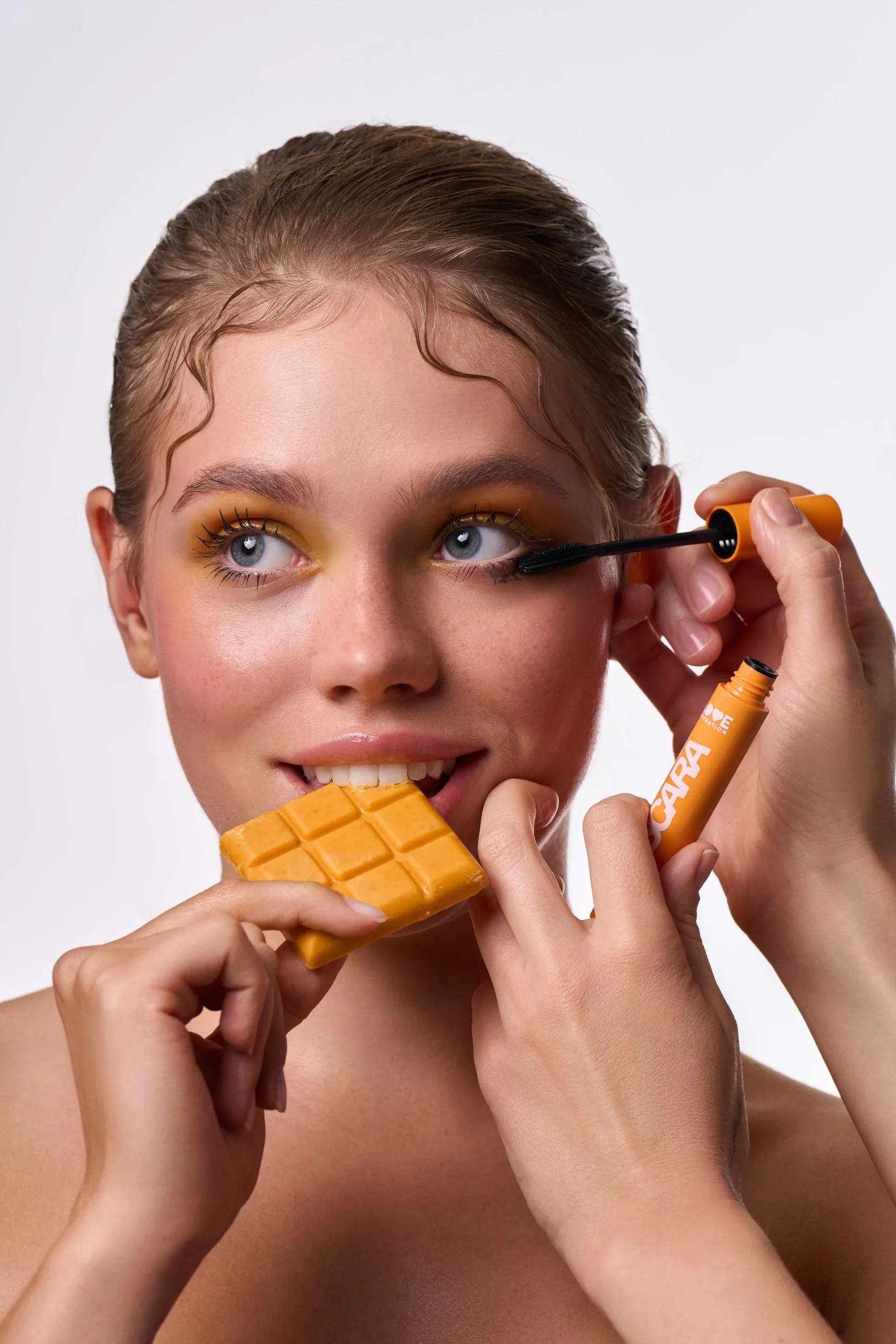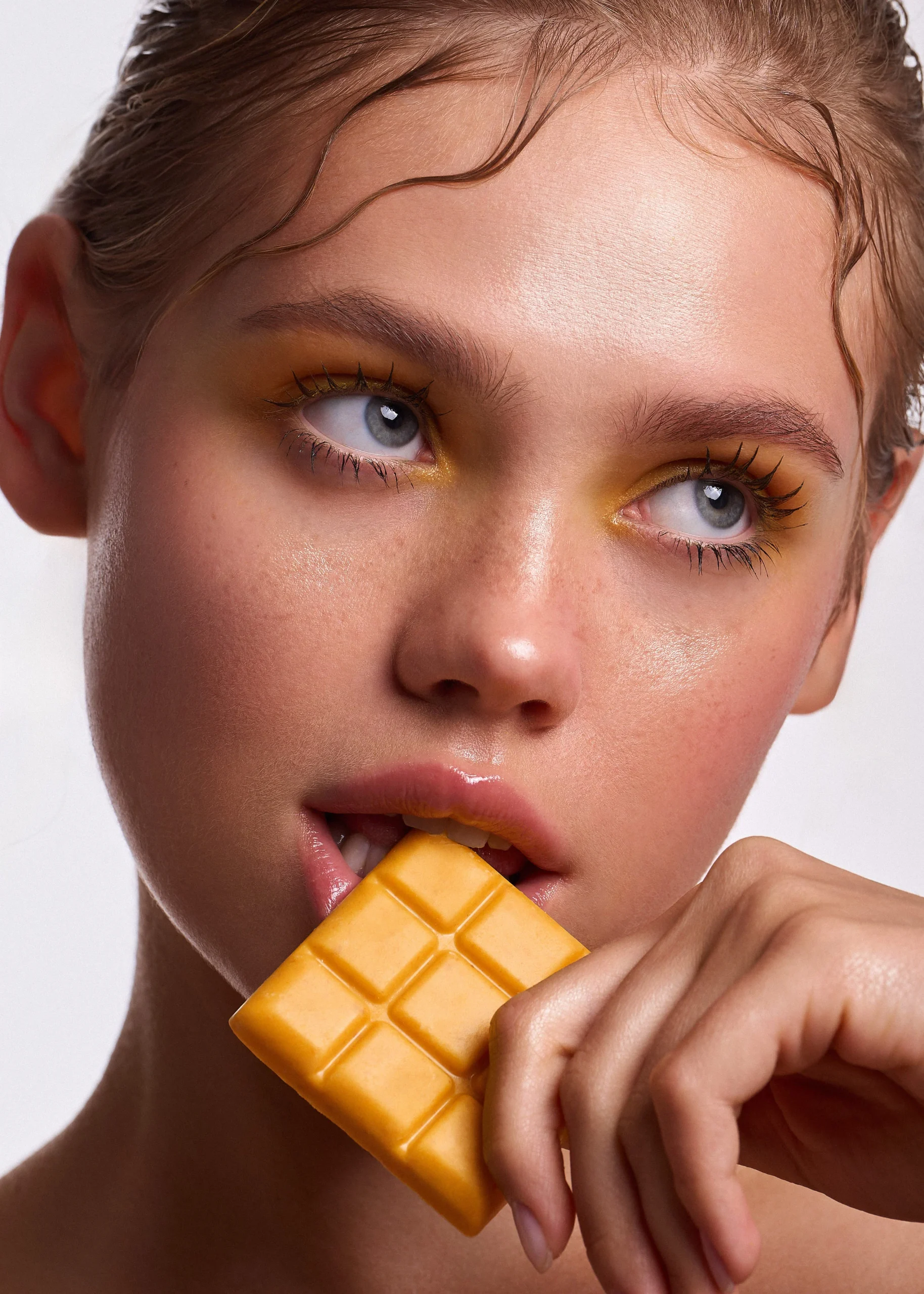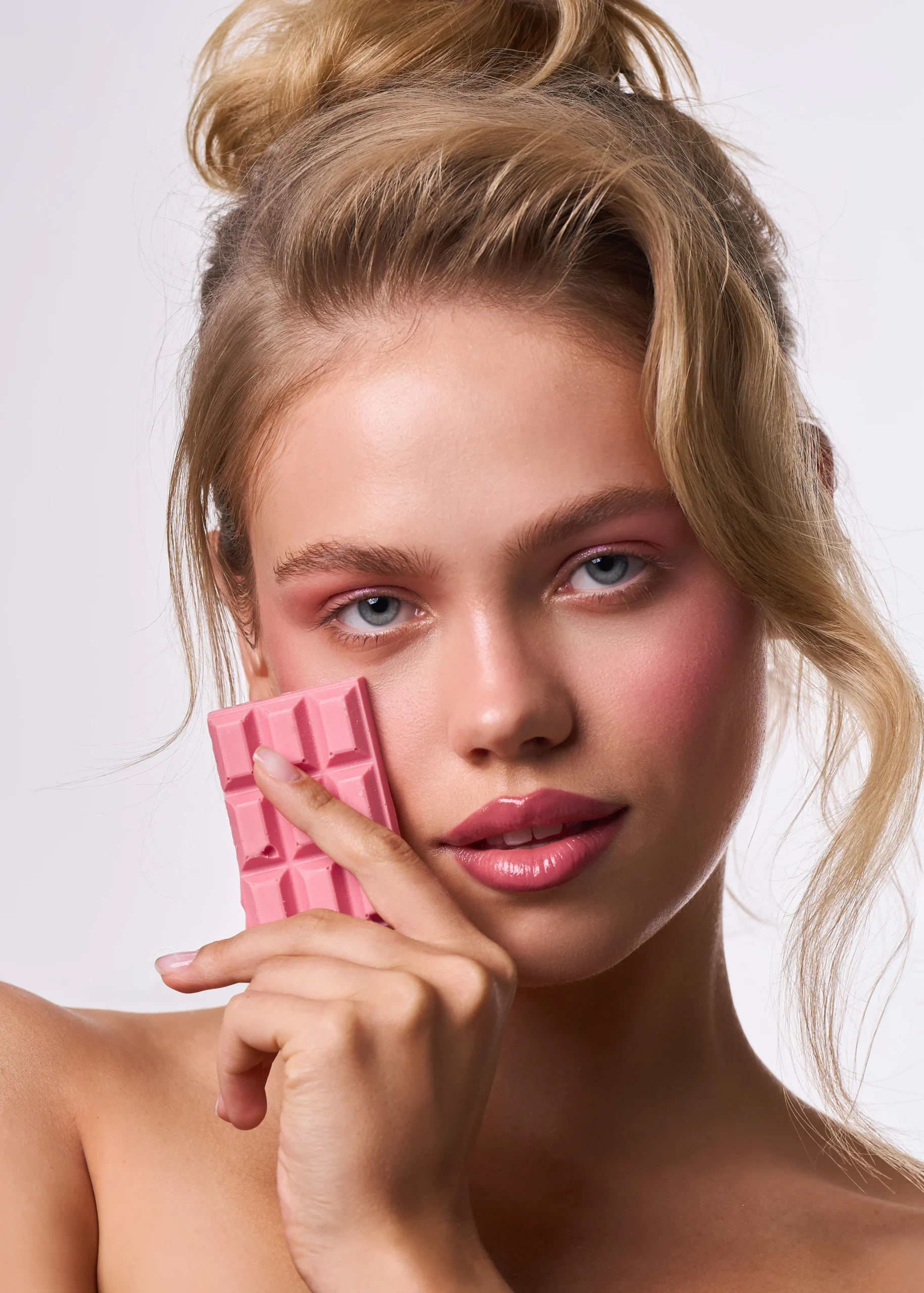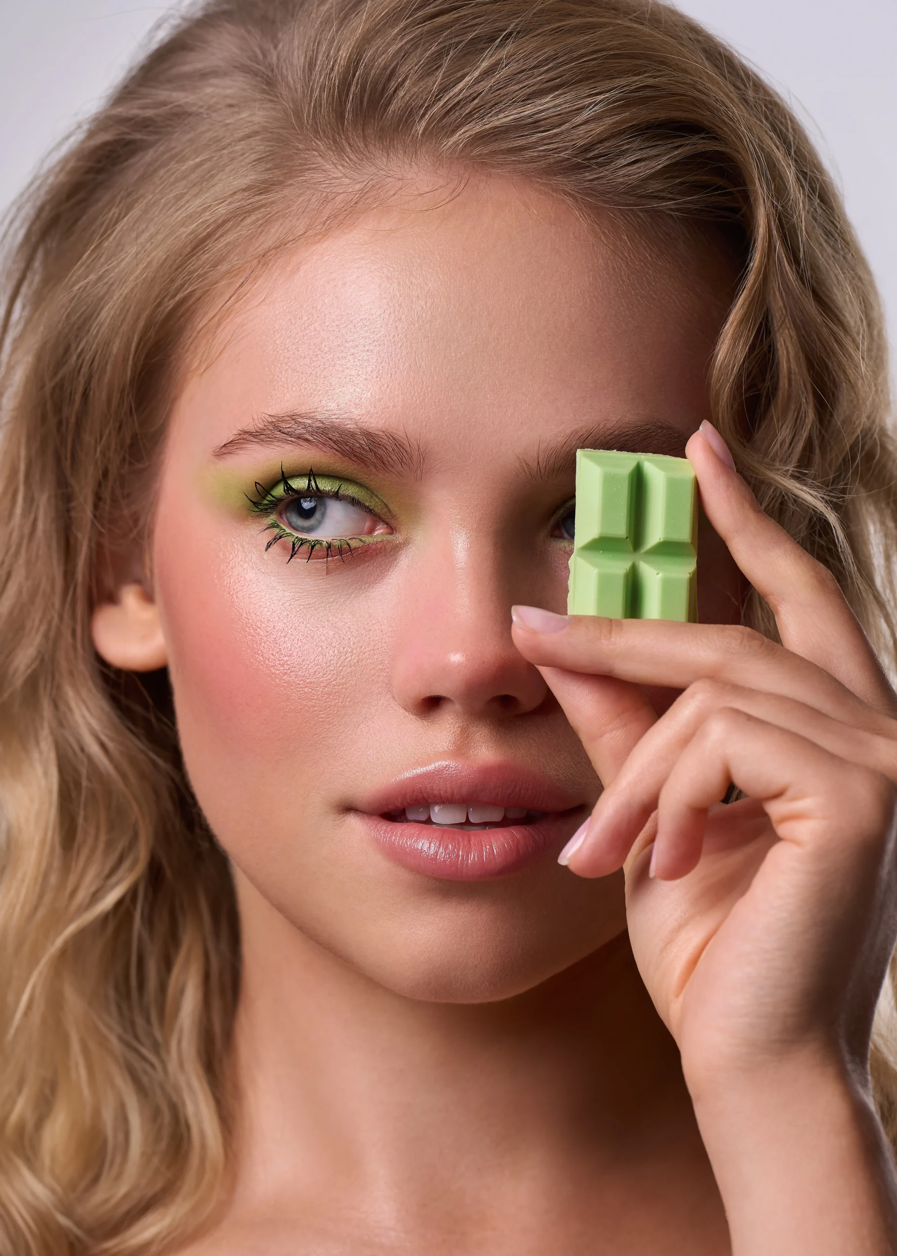 This beauty editorial is inspired by colourful chocolate—soft milk tones mixed with playful pinks, sunny yellows, and fresh pops of green. The skin stays natural and glowing, while the eyes do all the talking, blending creamy shades like melted chocolate in unexpected colours. Nothing feels too perfect or heavy; it’s fun, expressive, and a little dreamy. The overall look is sweet but confident, like chocolate reimagined as art rather than a treat.