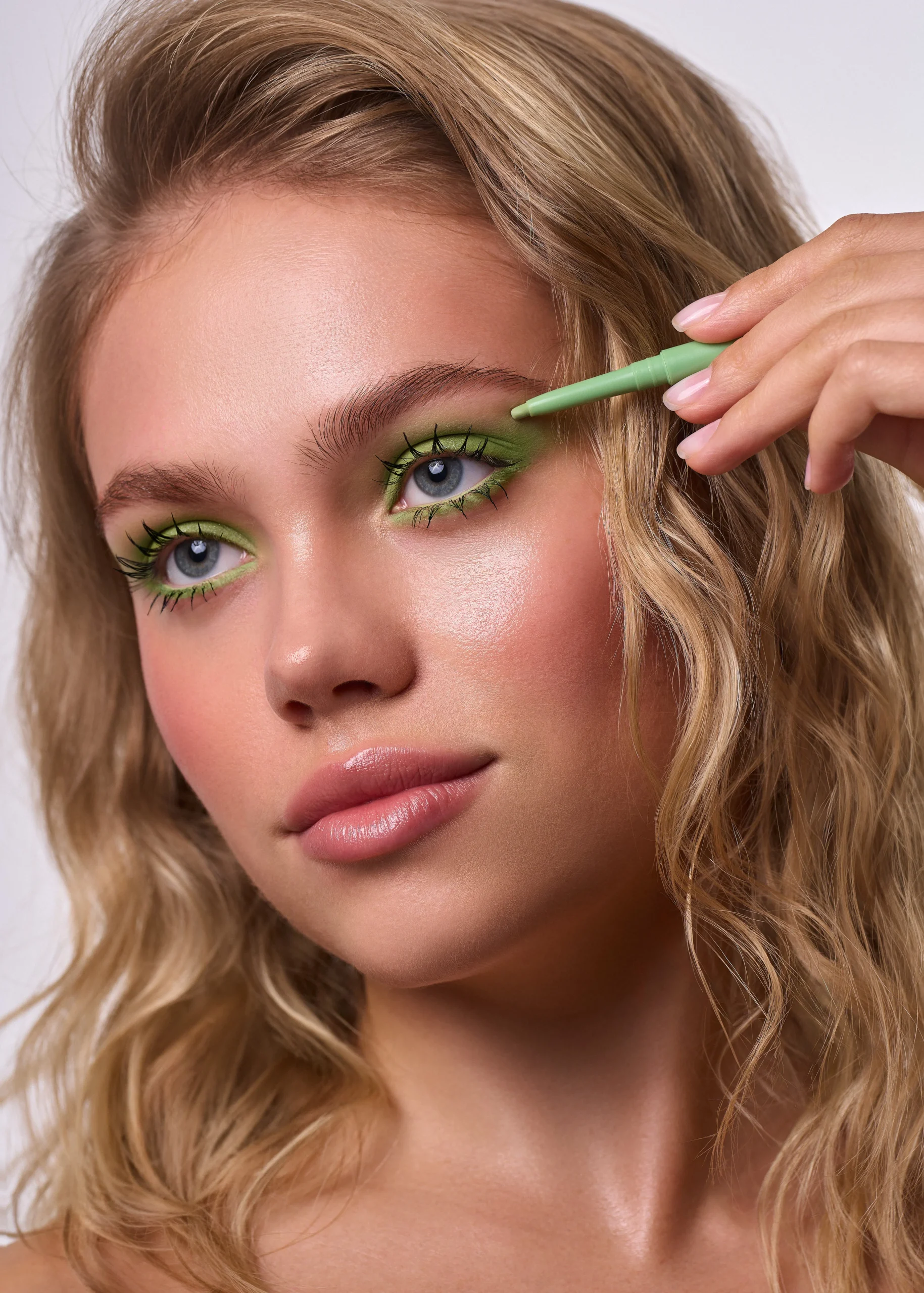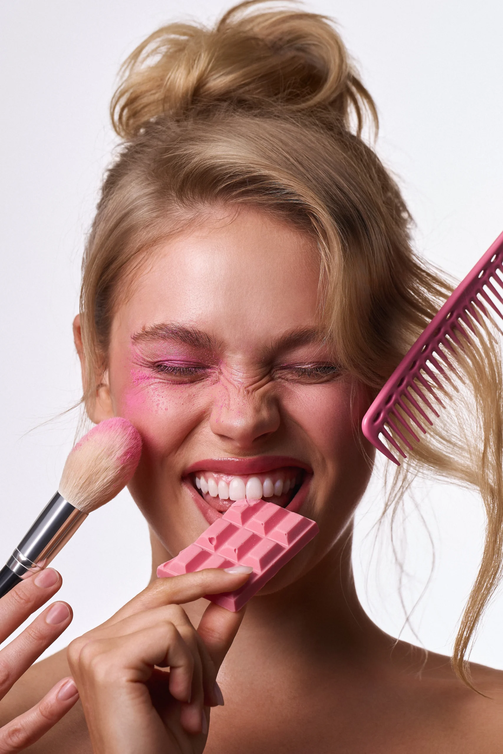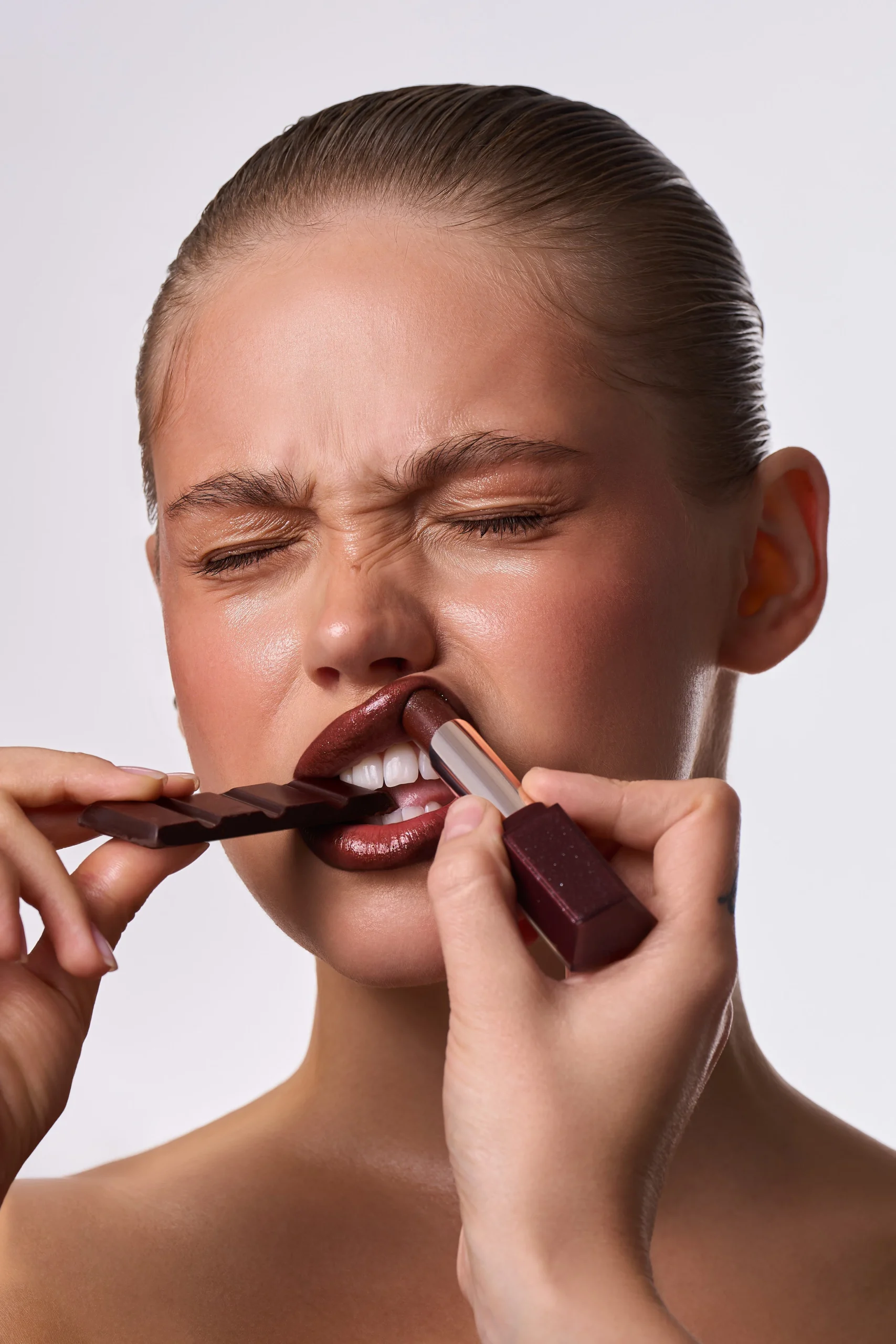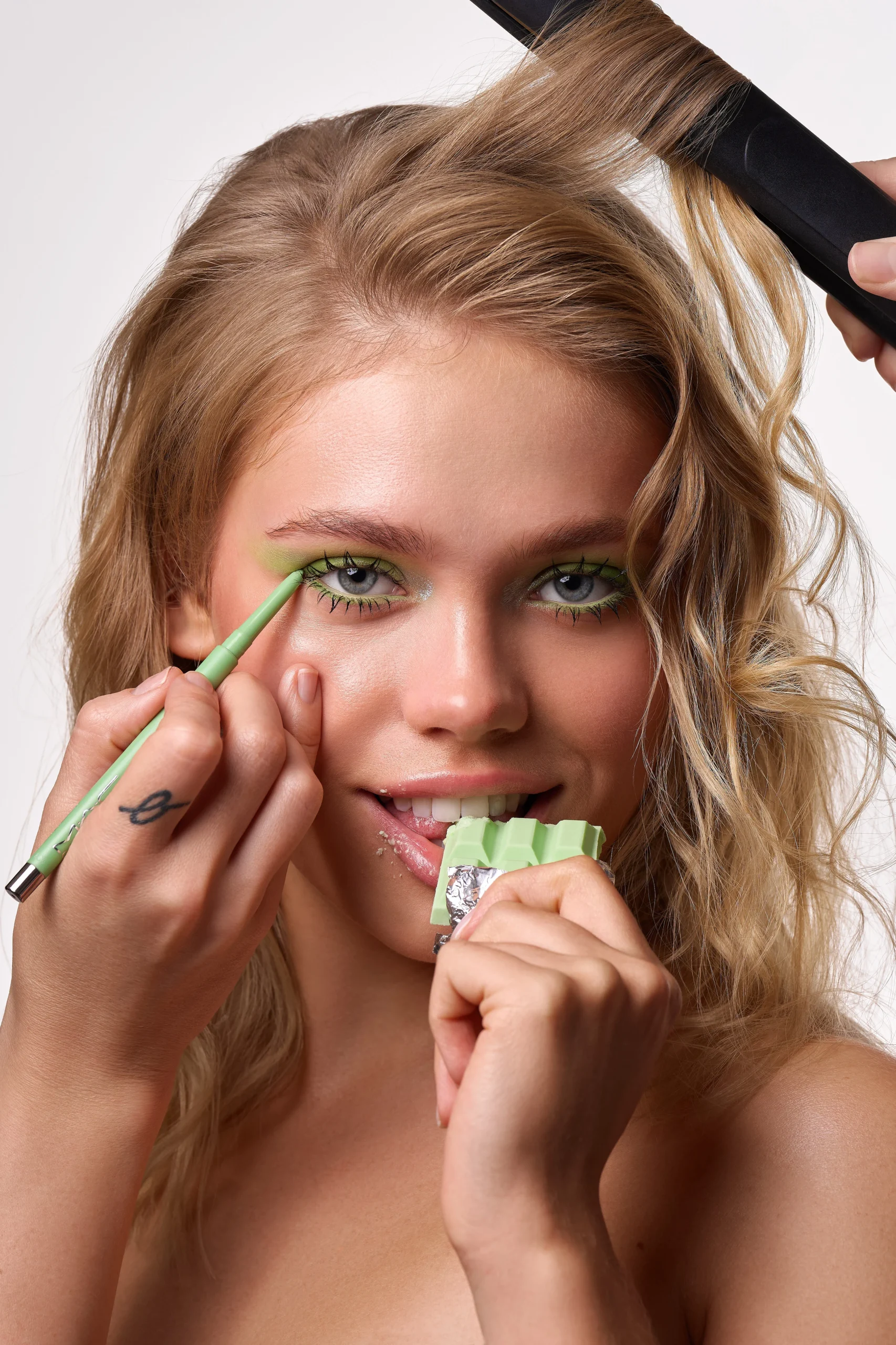 This beauty editorial is inspired by colourful chocolate—soft milk tones mixed with playful pinks, sunny yellows, and fresh pops of green. The skin stays natural and glowing, while the eyes do all the talking, blending creamy shades like melted chocolate in unexpected colours. Nothing feels too perfect or heavy; it’s fun, expressive, and a little dreamy. The overall look is sweet but confident, like chocolate reimagined as art rather than a treat.