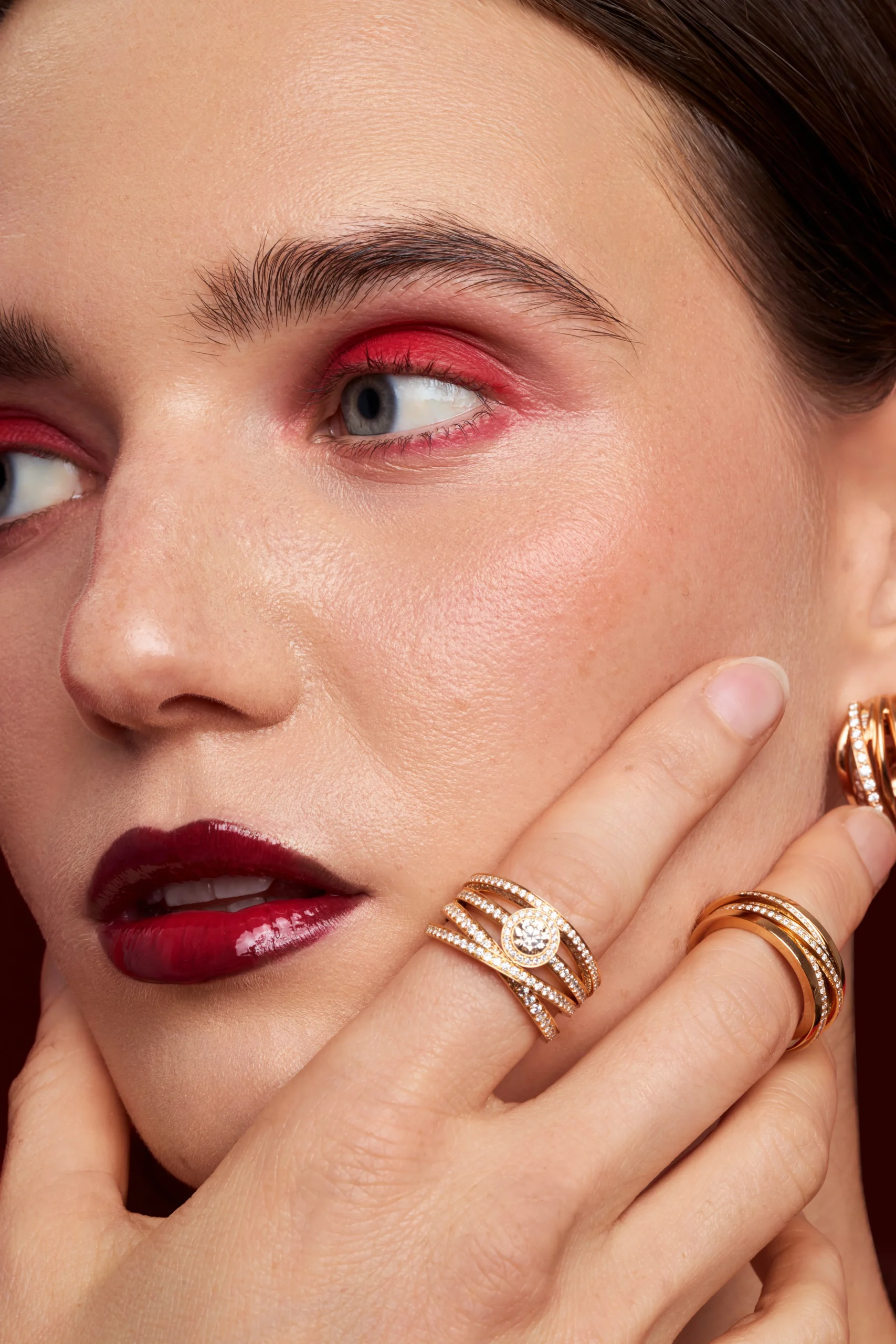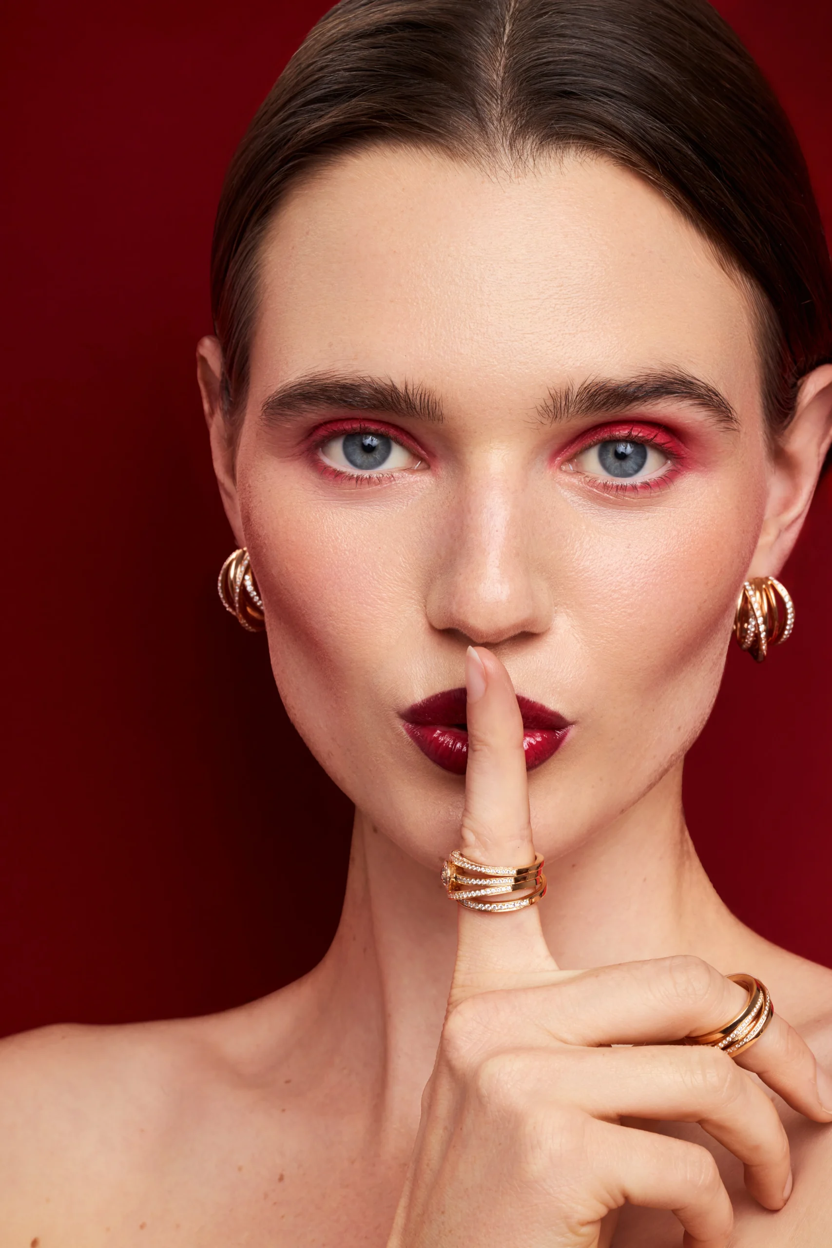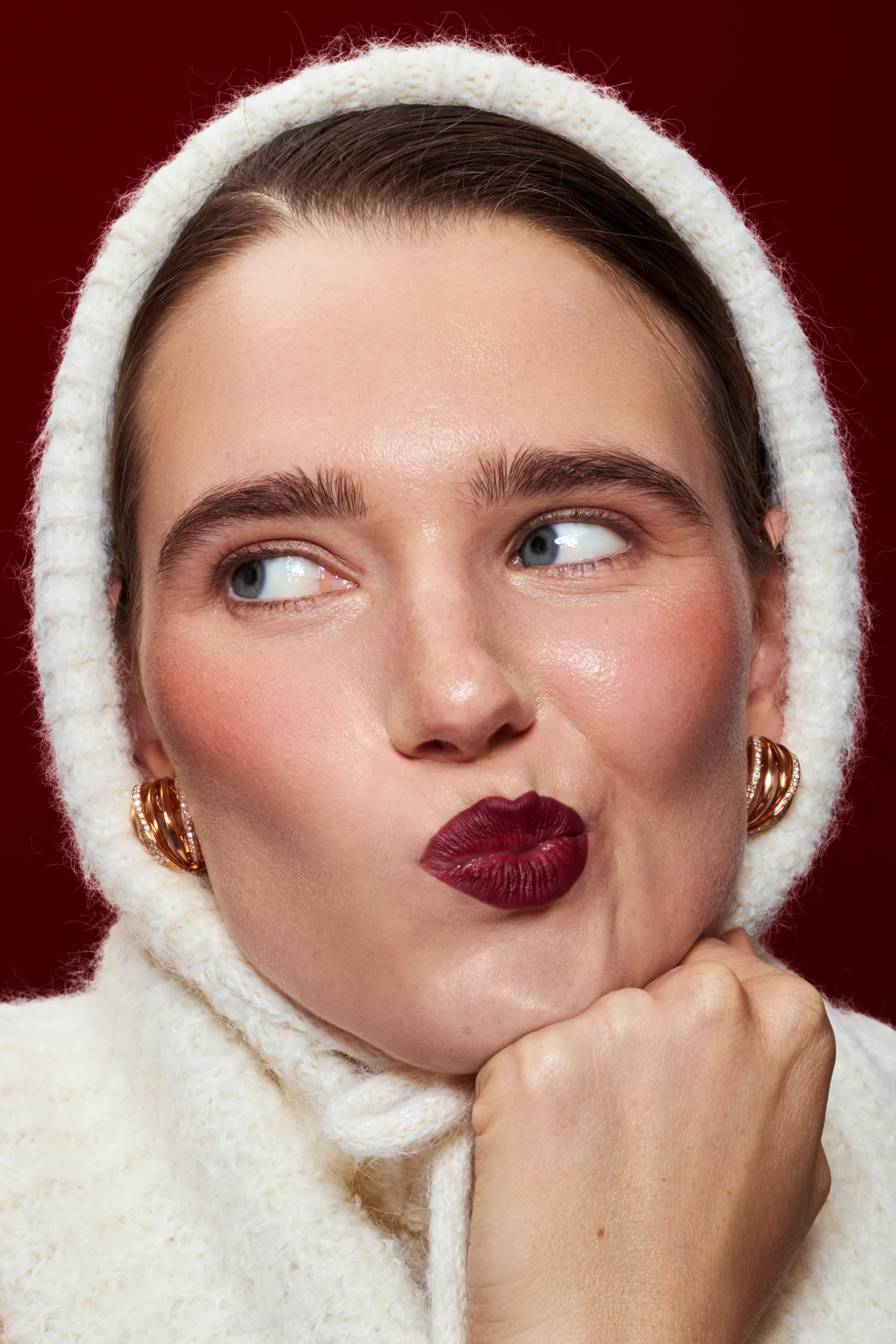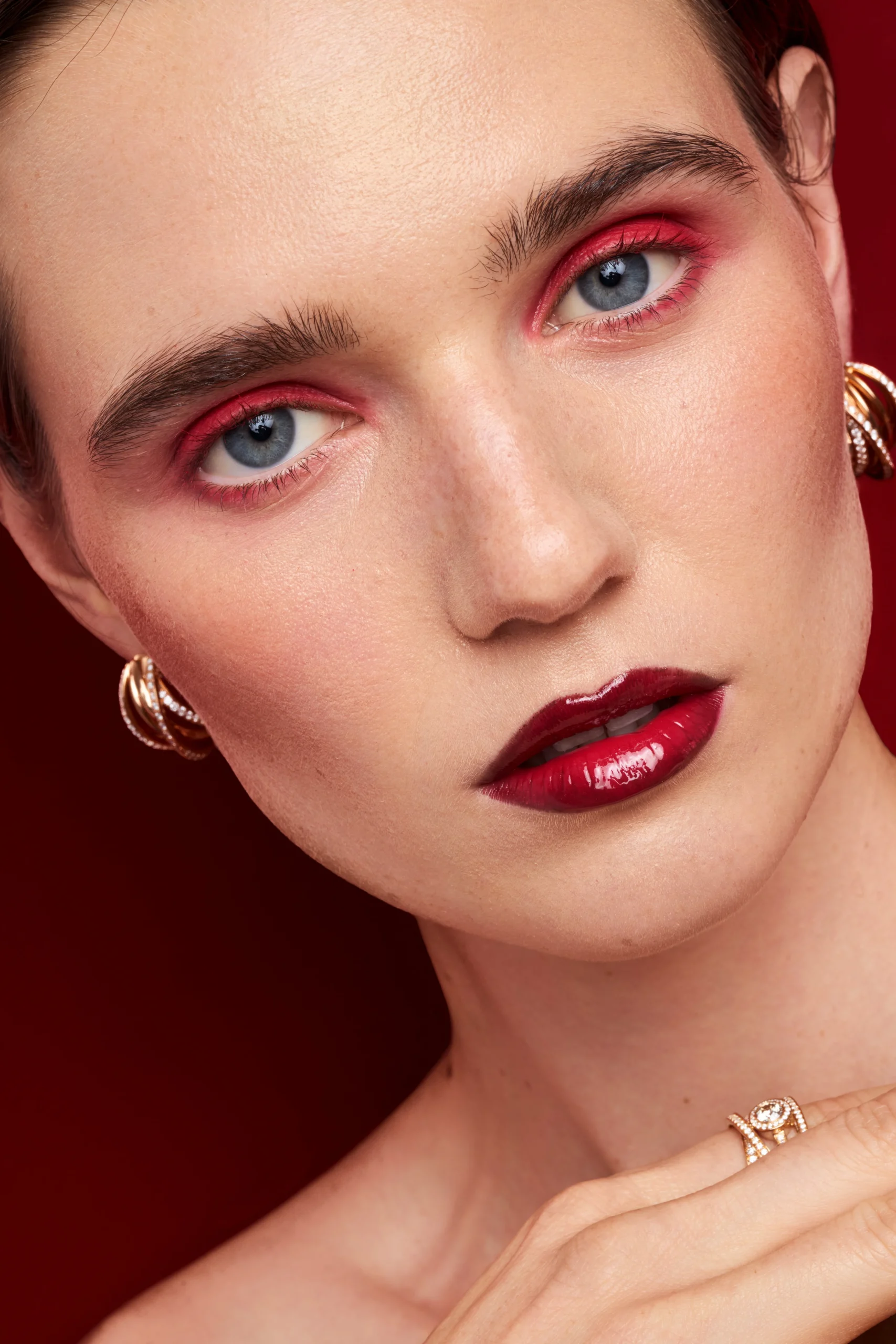A refined beauty story for the festive season unfolds on Paula Kautschitz — sculpted skin, lacquered berry lips and a red-to-plum palette meet bold silhouettes and statement jewelry. The mood is intimate and focused: quiet glamour, clean lines, and textures that glow in studio light.