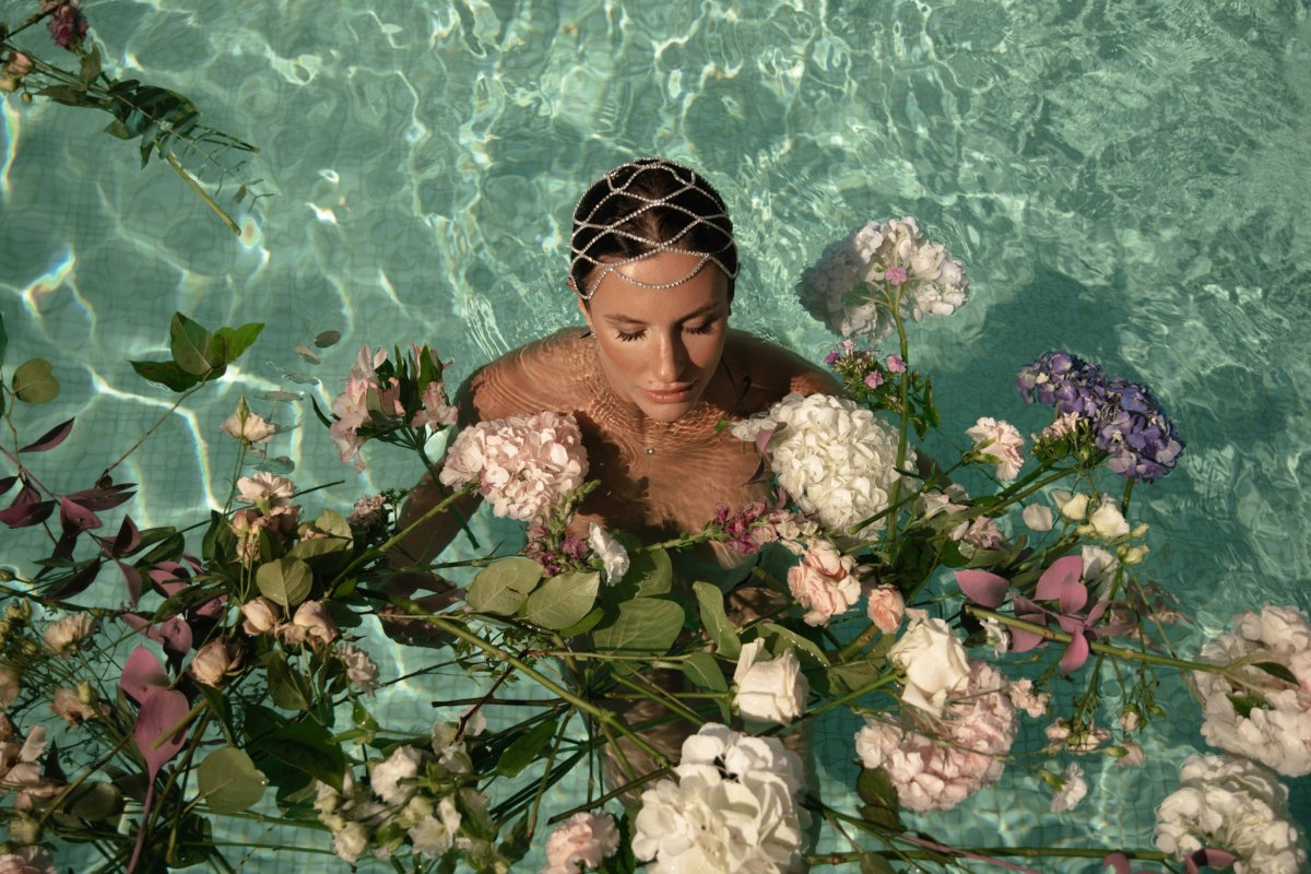 In Water Bloom, the model emerges from the tranquil waters, adorned with a delicate headpiece and surrounded by lush florals. Her serene expression reflects the enchanting blend of nature and luxury. Each…