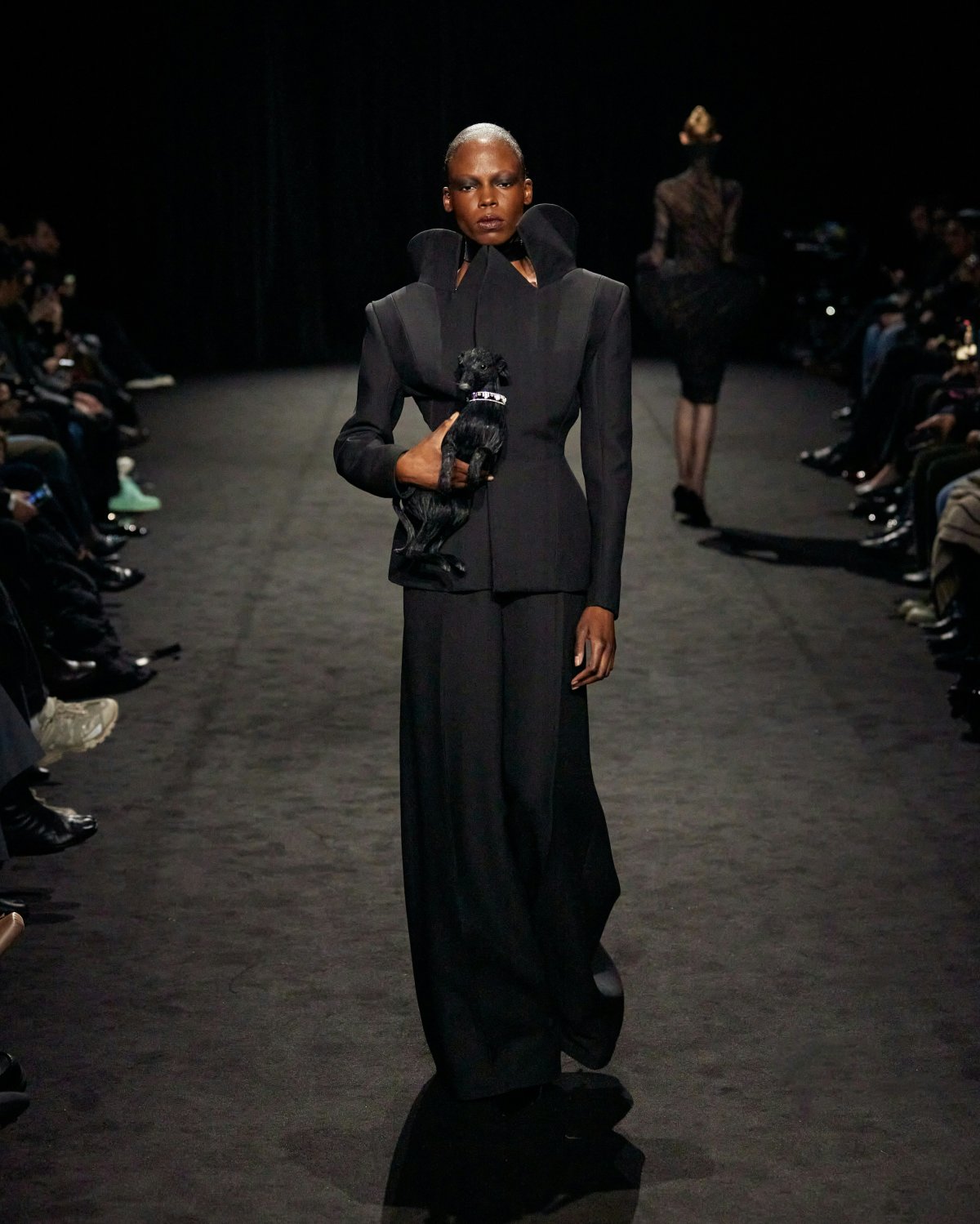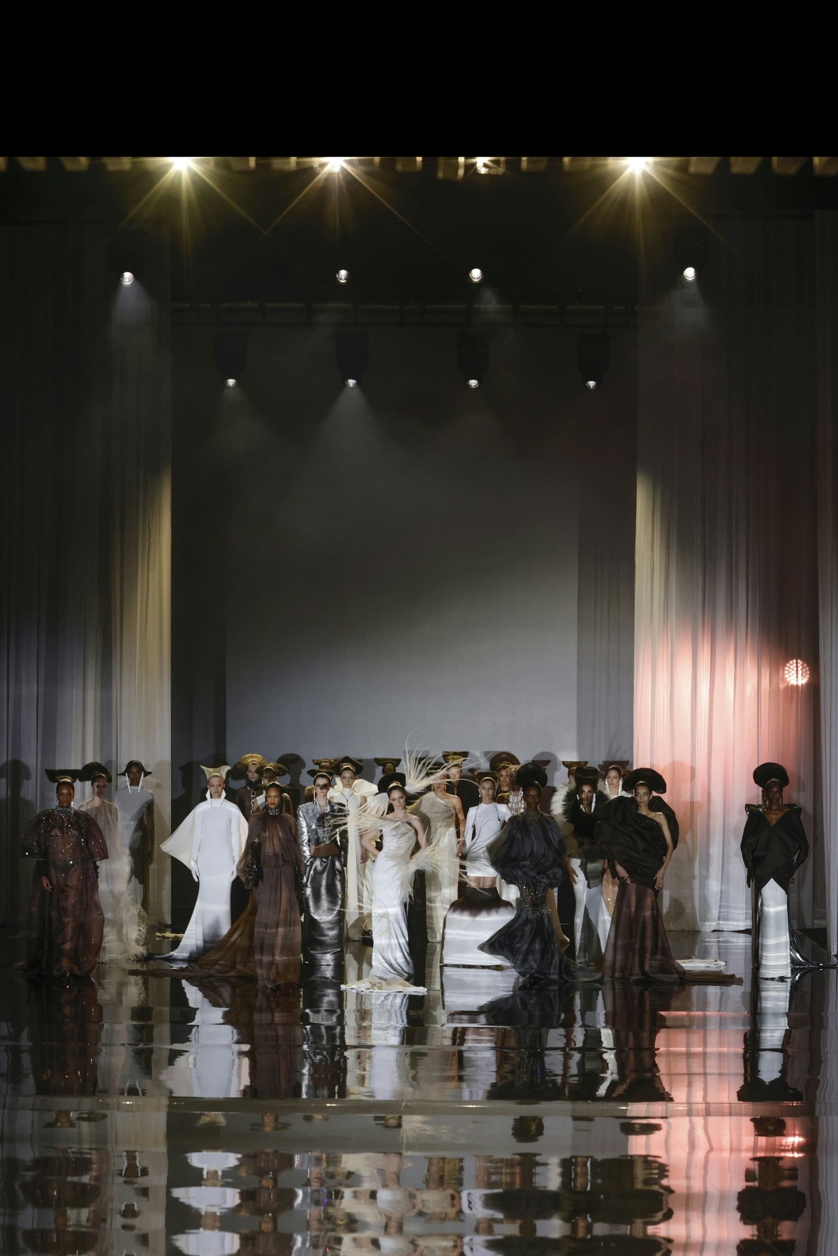 A reimagined tuxedo in black gazar and ebony satin, a white tunic adorned with golden vine embroidery cascading over the legs and a flowing cape dress in white crepe or a cubic…