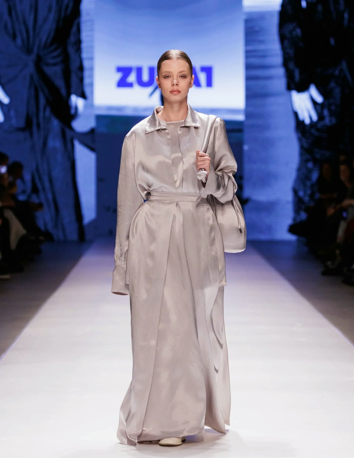 Leading the charge is Zuhat, blending timeless elegance with contemporary flair. The ZUHAT brand’s collection features gentle curves, tranquil silhouettes, layering, extended lengths, and a monochromatic color scheme ranging from deep black to delicate shades of pearl and ivory. Inspired by the imagery of Dagestani women, the collection’s focal point is the inclusion of maxi dresses and coordinated sets with elongated skirts. Drawing from the sight of women gracefully walking to springs with their hems tucked at the waist, the collection incorporates elements of asymmetric draping into its skirts and dresses. Completing the looks are tote bags with broad straps reminiscent of those once used to carry pitchers.