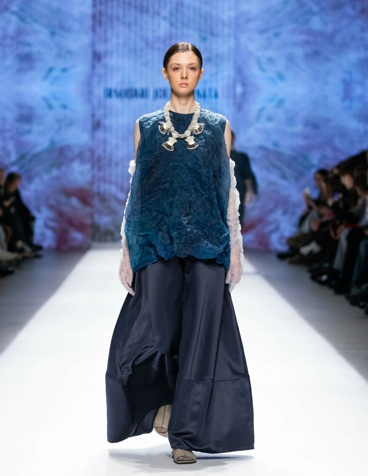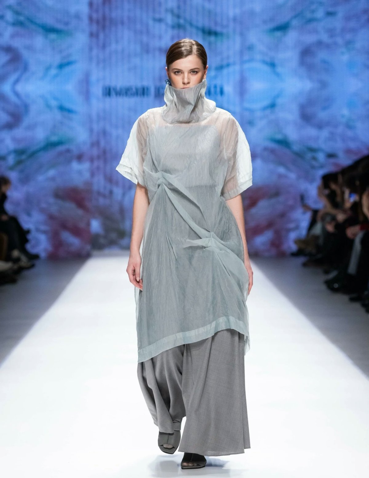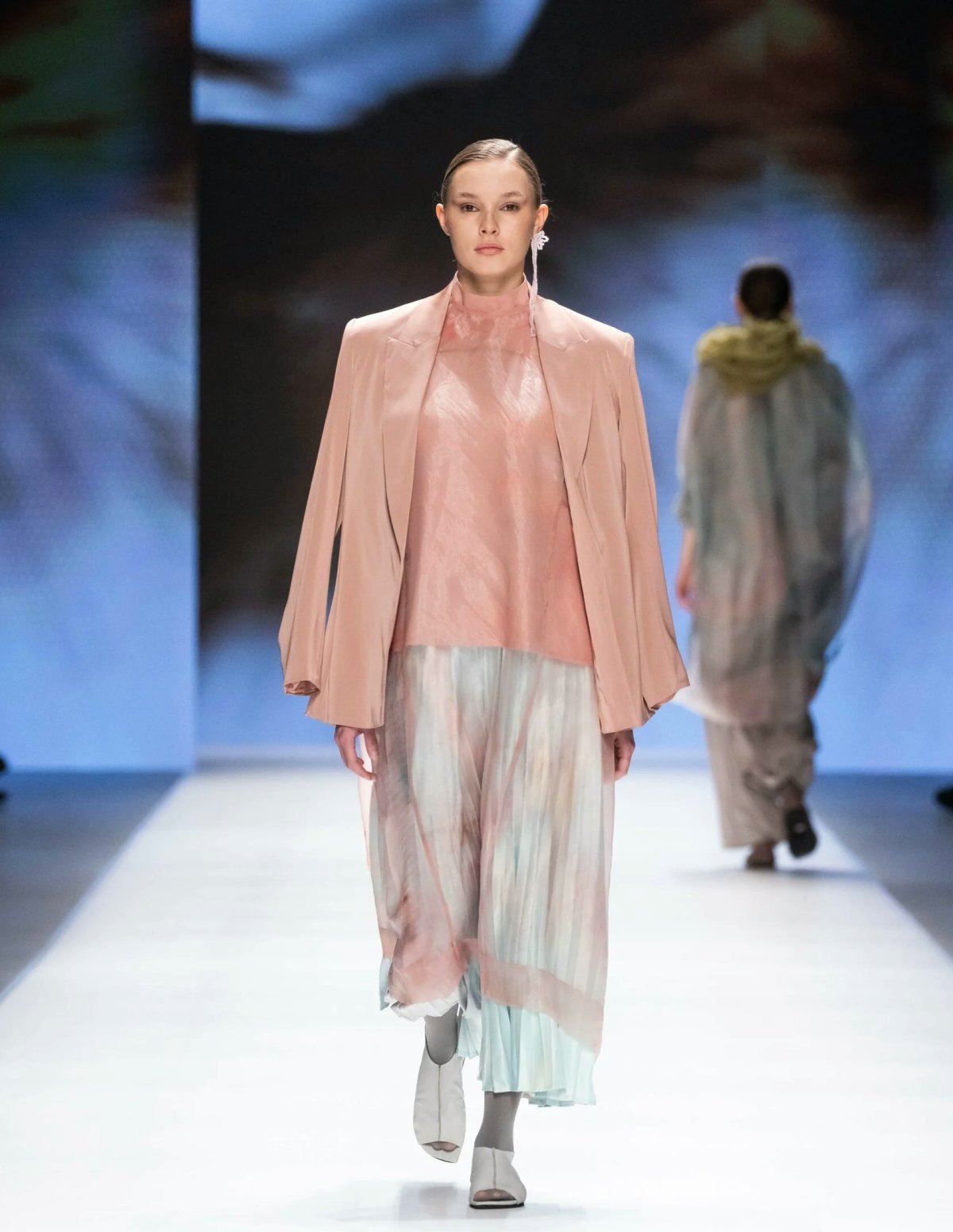 The brand from Indonesia, IRMASARI JOEDAWINATA, brought with it the atmosphere of a distant and misty coastline, which could be easily imagined through smooth silhouette lines and transparent materials layered upon each other. The mood of salty water and air was maintained by a delicate natural palette dominated by shades of pink chalk, gray sand, coastal stones, sea blue, and tropical greenery. The collection left a sense of freedom and lightness, despite its multi-layered nature: cocoon silhouettes enveloping the models’ figures were complemented by airy scarves made of pleated silk; the same pleated silk appeared as the main texture in tops and dresses, resembling either sea foam or