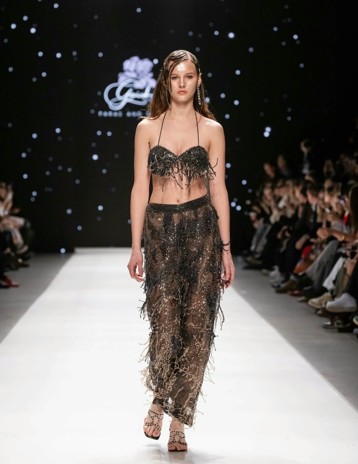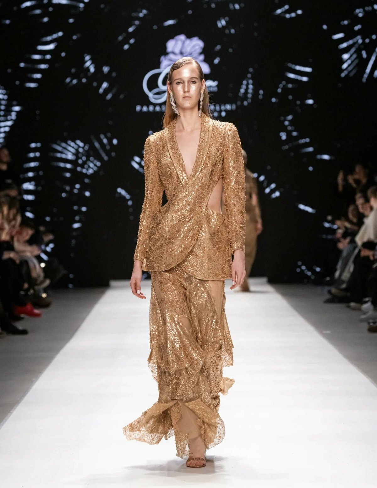 The new evening wear collection from the Indian brand Geisha Designs draws inspiration from the icy sparkle of crystals. The metallic radiance is brought to life through an abundance of rhinestones and sequins, while dynamic elements like fringes and ruffles create a shimmering effect with movement.