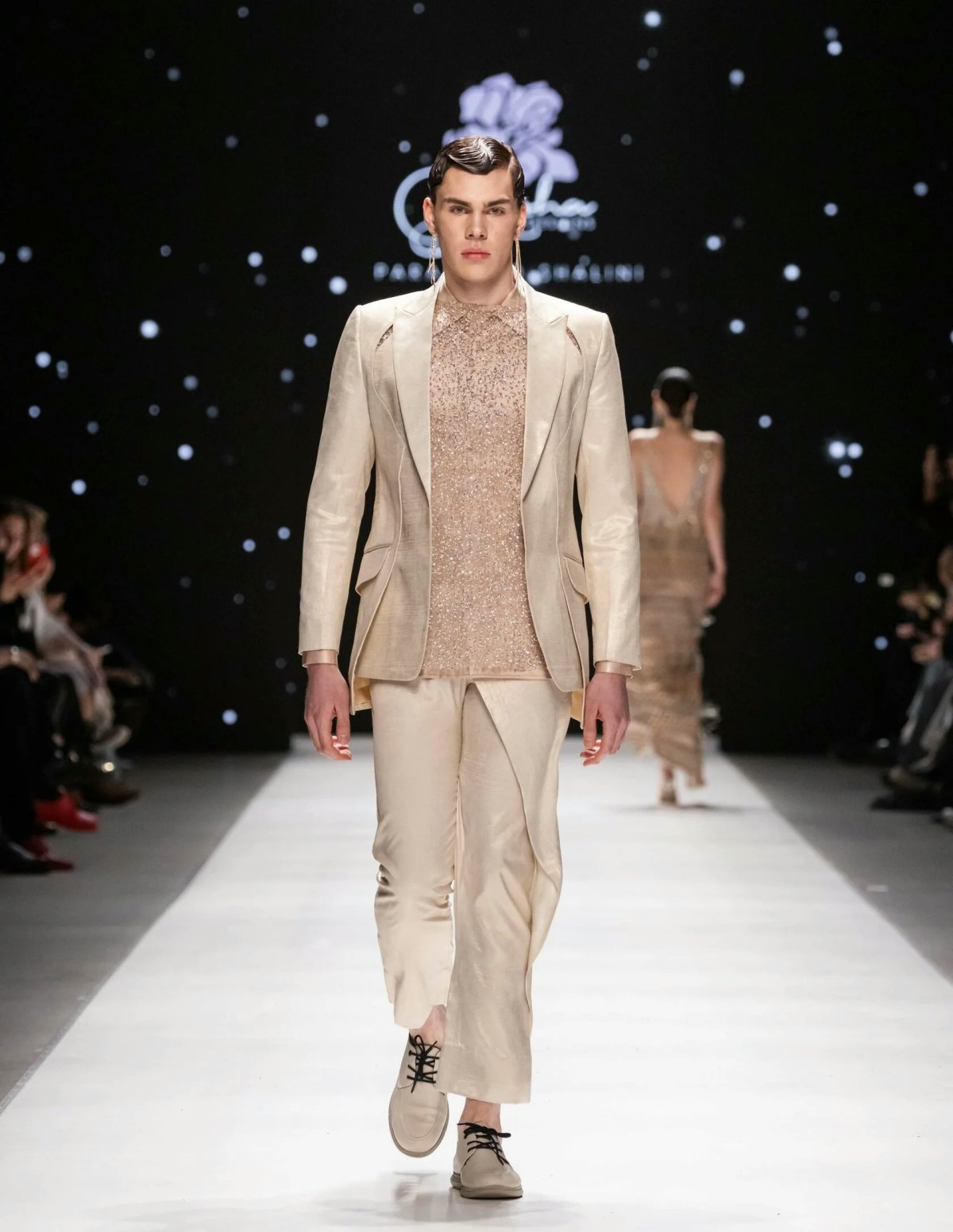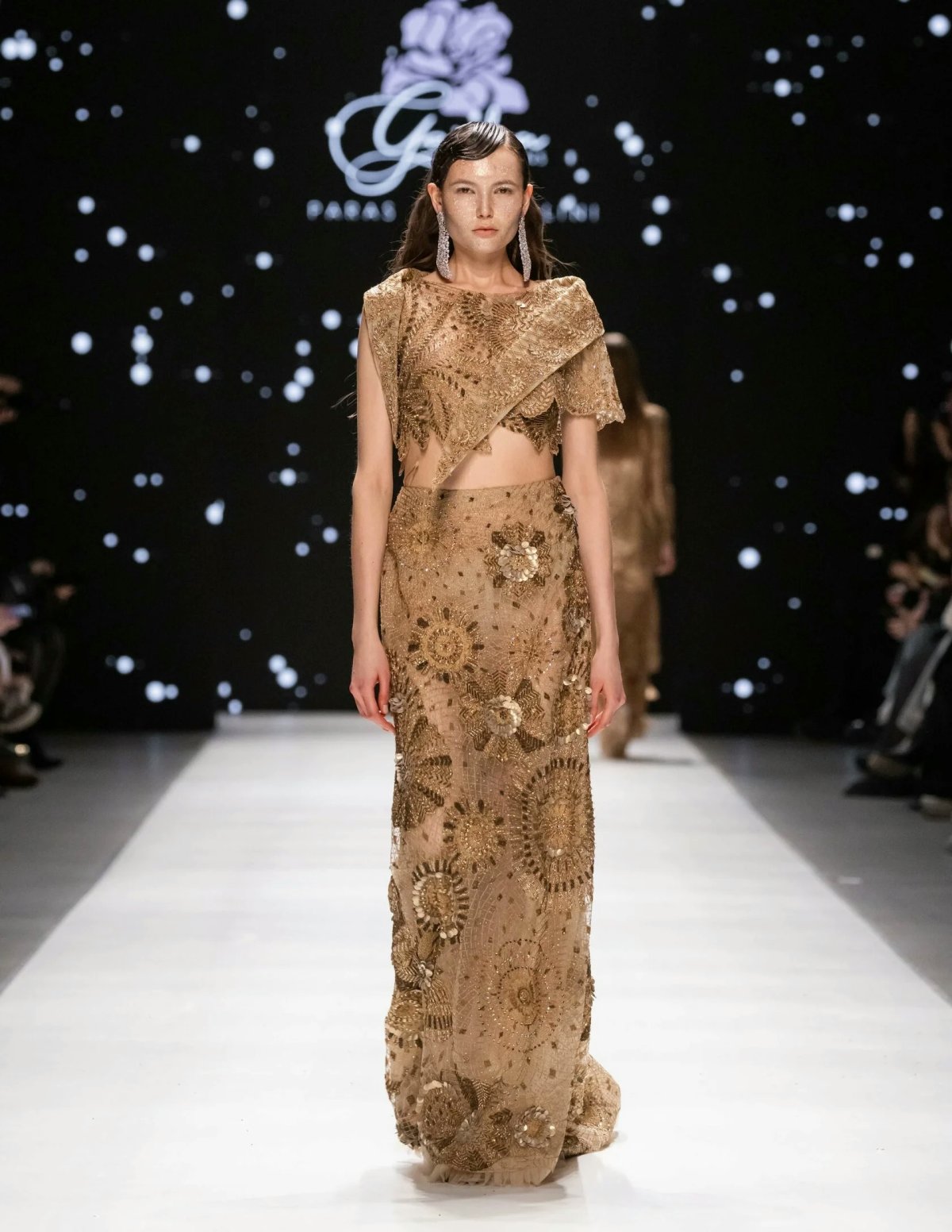 The designers skillfully blend traditional uniqueness with a modern aesthetic in this collection, with asymmetric silhouettes reminiscent of Indian saris and contemporary touches like cutouts and sheer fabrics. Alongside women’s ensembles, the runway showcased men’s trouser suits adorned with crystals for a touch of glamour.
