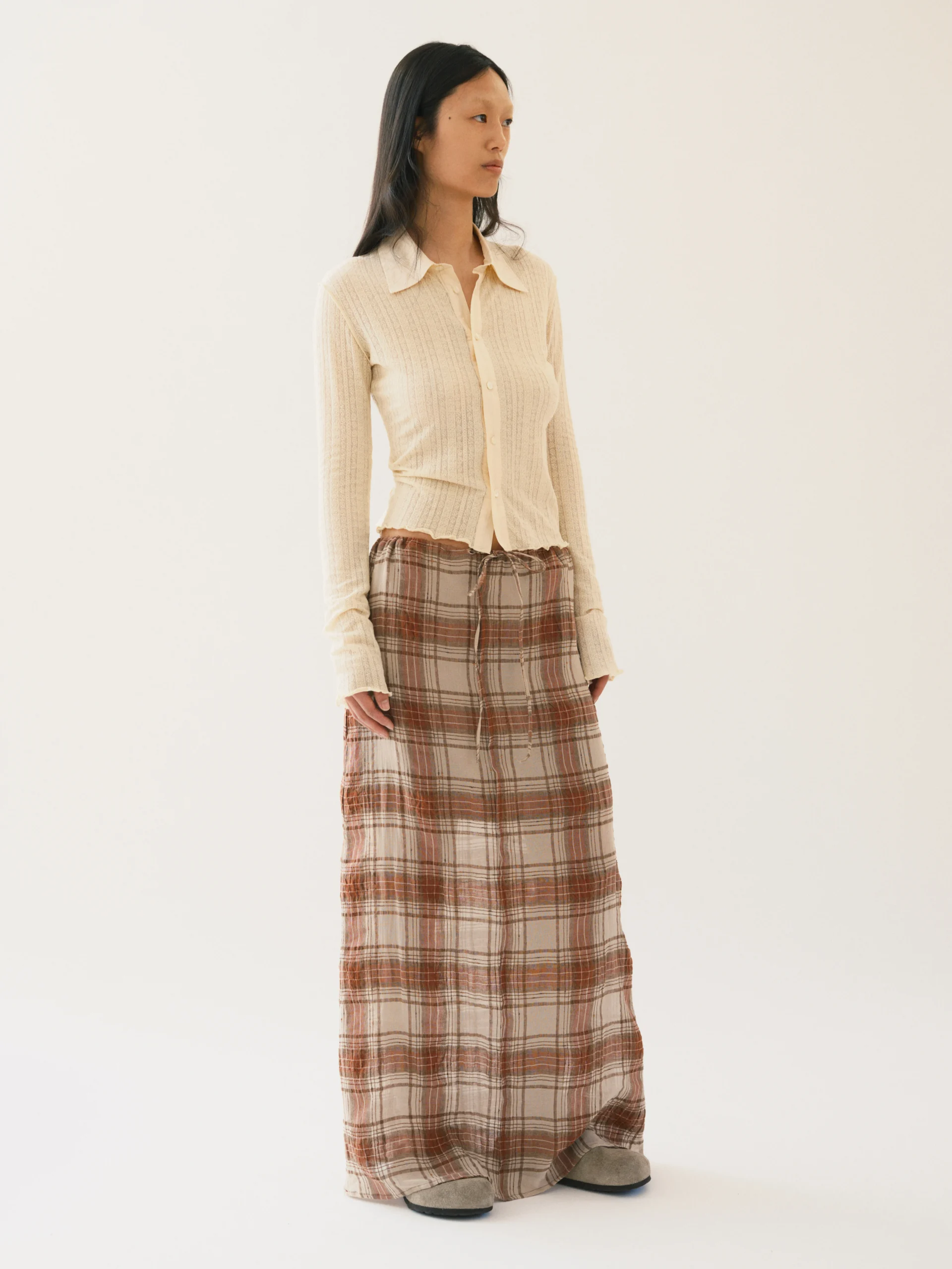 Colour plays a restrained but expressive role. Greys and muted blues sit alongside earthy tones, all grounded in a pale, blond Nordic palette reminiscent of birch wood and early daylight. The collection captures the crisp uncertainty of early spring—cool, restrained, and slightly surreal—where nothing feels entirely settled, and that is precisely where its character resides.