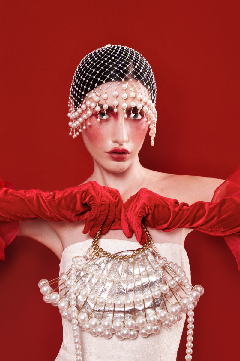 Corset: OTrebla; Stockings: Primark; Panties: Primark; Pearl Cap: Asos Design; Shoes: Primark; Bag: Handmade
